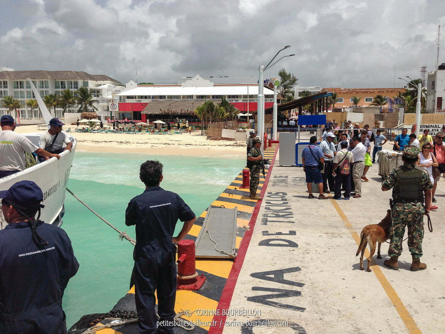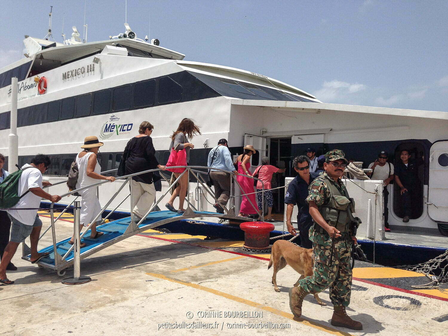 La présence de ce chien renifleur de drogue sur le quai de Batangas me rappelle une scène identique, lors de mon voyage au Mexique en 2014, sur le quai de Playa del Carmen, quand j’avais embarqué à bord du ferry pour l’île de Cozumel. Je ne crois pas l’avoir mentionné dans mes posts de l’époque, mais j’ai retrouvé ces deux photos que j’avais prises en douce (je me souviens qu’un des militaires mexicains m’avait fait signe de ranger l’appareil) :