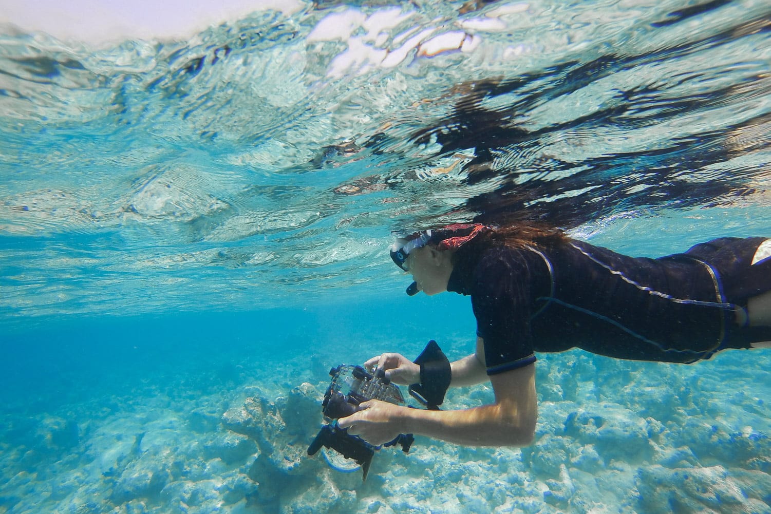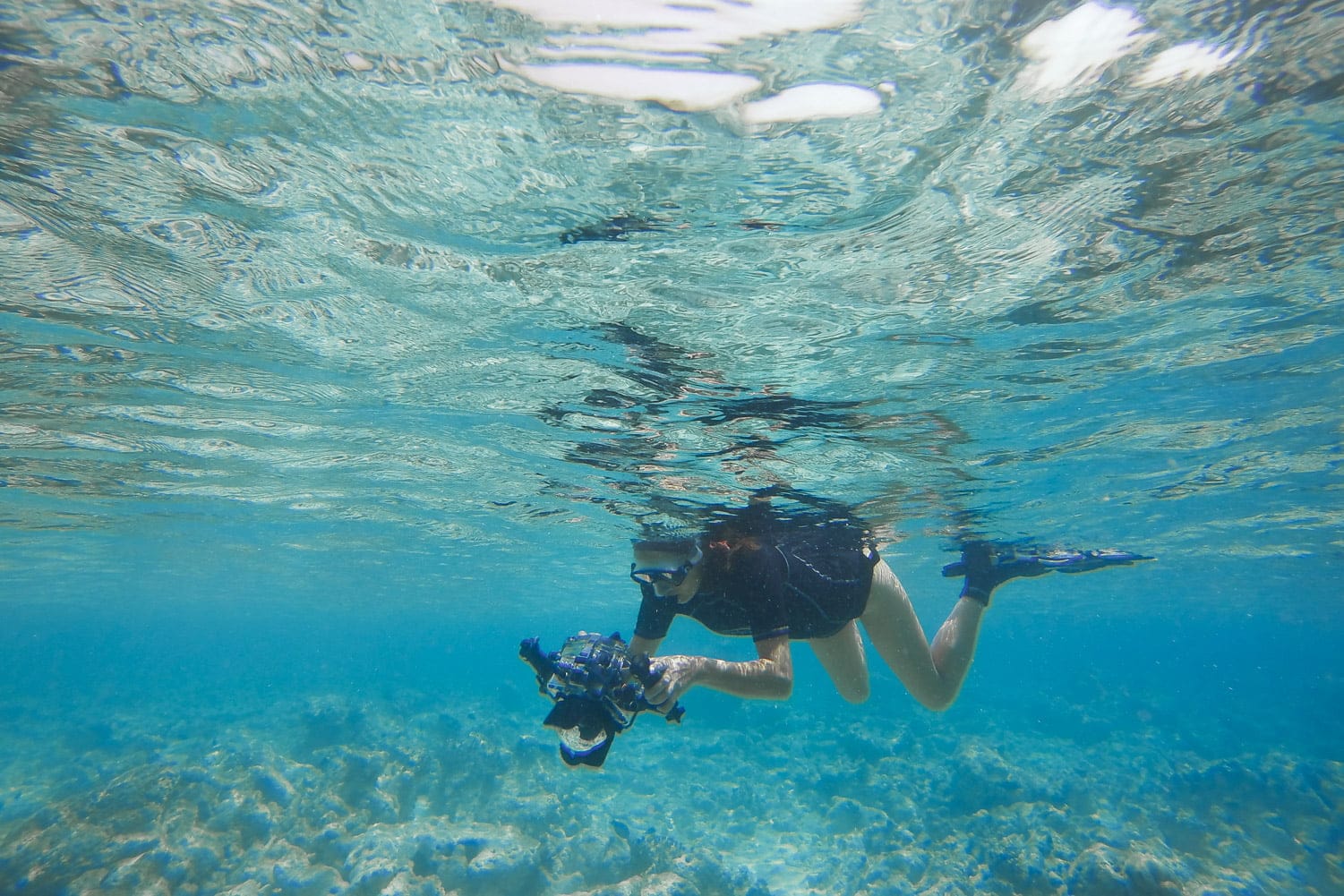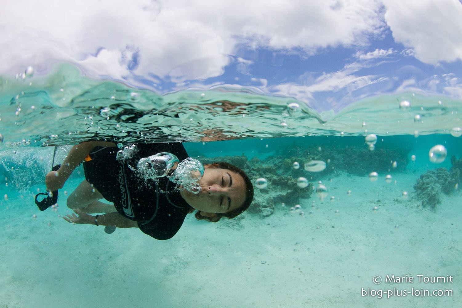 Moi, pas très douée pour tenir sans respirer sous l’eau, je me contentais de de barboter en surface avec mon appareil-photo. Admirez la position gracieuse… (Merci à Jeff pour les photos !)