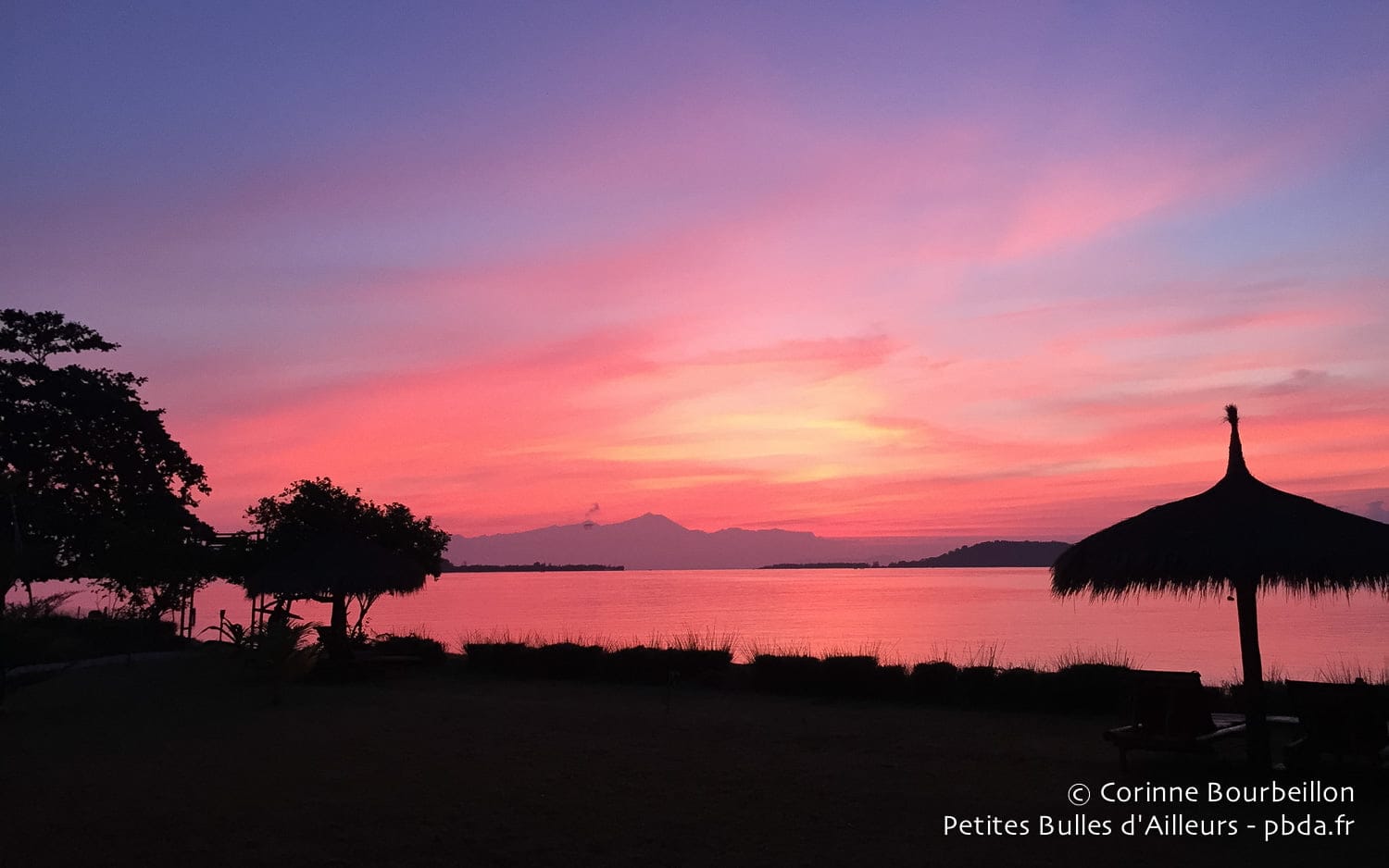 Le temps suspend son vol. Mon premier coucher de soleil est somptueux. Je découvre, la nuit venue, des milliards d’étoiles. Et je m’endors béatement, pas le moins du monde dérangée par les gloussements des geckos.