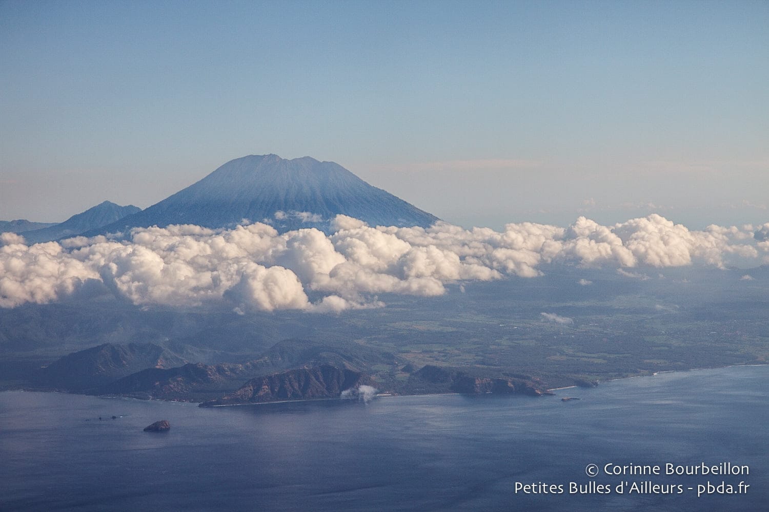C’est donc sans avoir besoin d’enregistrer de bagage en soute que j’ai pris un vol domestique, en début de matinée pour Lombok, sur Lion Air (la fameuse compagnie indonésienne avec livret de prières dont j’ai déjà parlé ici). Vue sublime sur le volcan Agung qui domine Bali. Une grosse demi-heure de vol.
