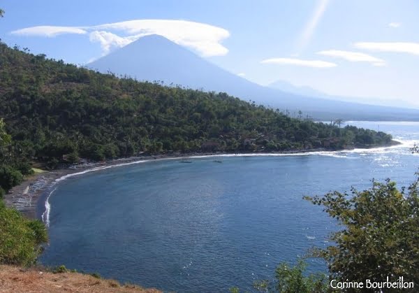 La balade est tranquille, car il y a peu de trafic entre les villages qui s’égrennent le long du littoral, dominé par l’ombre impressionnante du volcan Agung : Amed, Bunutan, Jemeluk, Lipah…