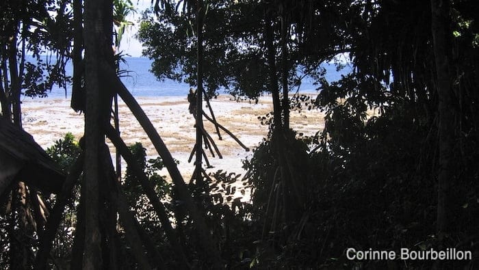 La partie la plus délicate du trajet est en fait pour rallier l’île à partir du bateau, ou en revenir. Nous étions un petit groupe de huit, pas tous équipés de botillons ni de sandales permettant de marcher sans se couper sur la grève de corail mort.