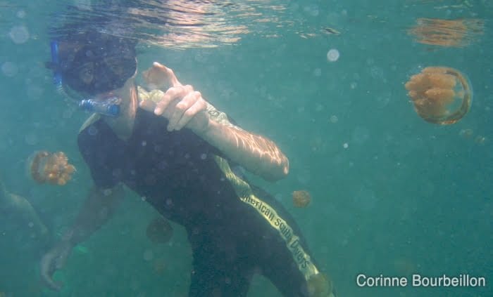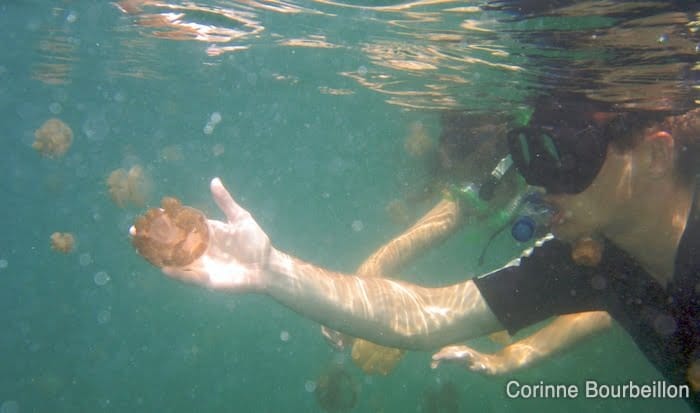 C’est une chose de le savoir, que les méduses ne piquent pas. C’en est une autre de se glisser dans cette eau chaude, verdâtre et saumâtre, et de vérifier par soi-même que les fameuses méduses sont bien inoffensives…