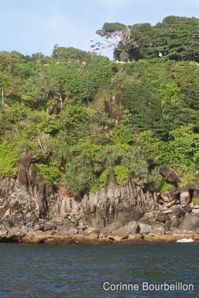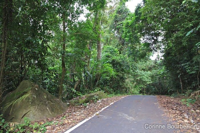 Goudron neuf, en excellent état pour rouler, très peu de circulation. La route longe la côte nord-est parmi les collines, entre mangroves, grèves un peu désolées à marée basse et bouts de jungle touffue.