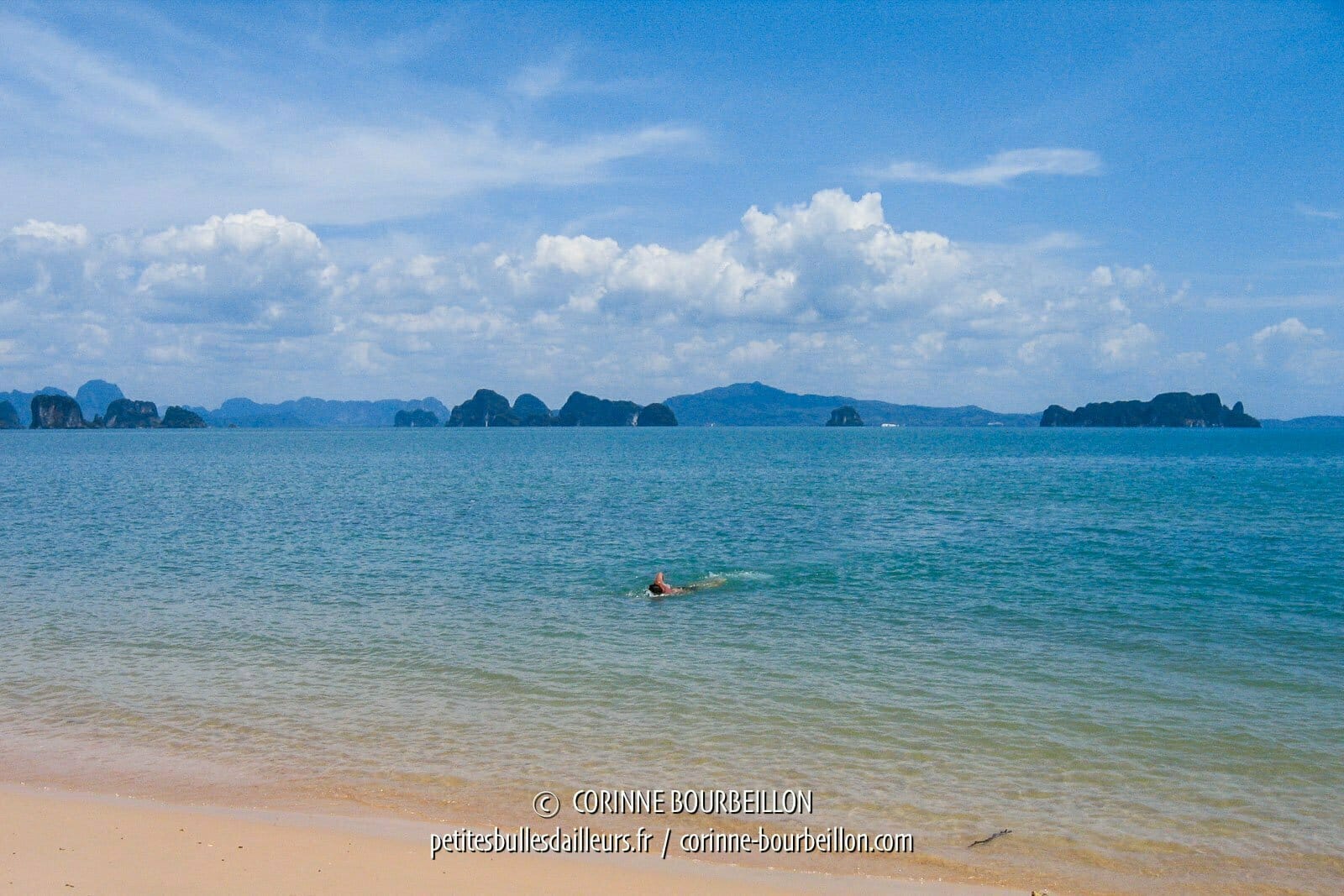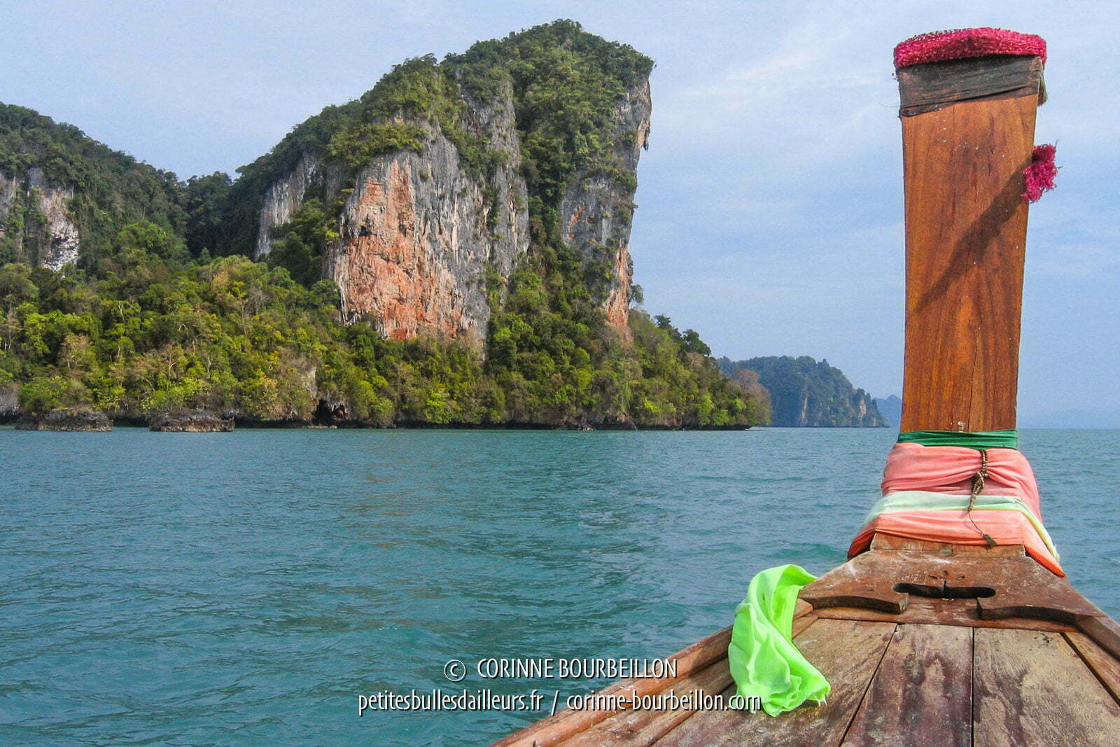 Mais je ne peux pas vous montrer la vue bien connue, plus spectaculaire, qu’on prend depuis la plage… Quand on a vu la foule débarquer par speed-boats entiers sur les rochers, pour piétiner cette minuscule langue de sable, on a préféré rester au large et filer vers d’autres îlots, moins fréquentés…