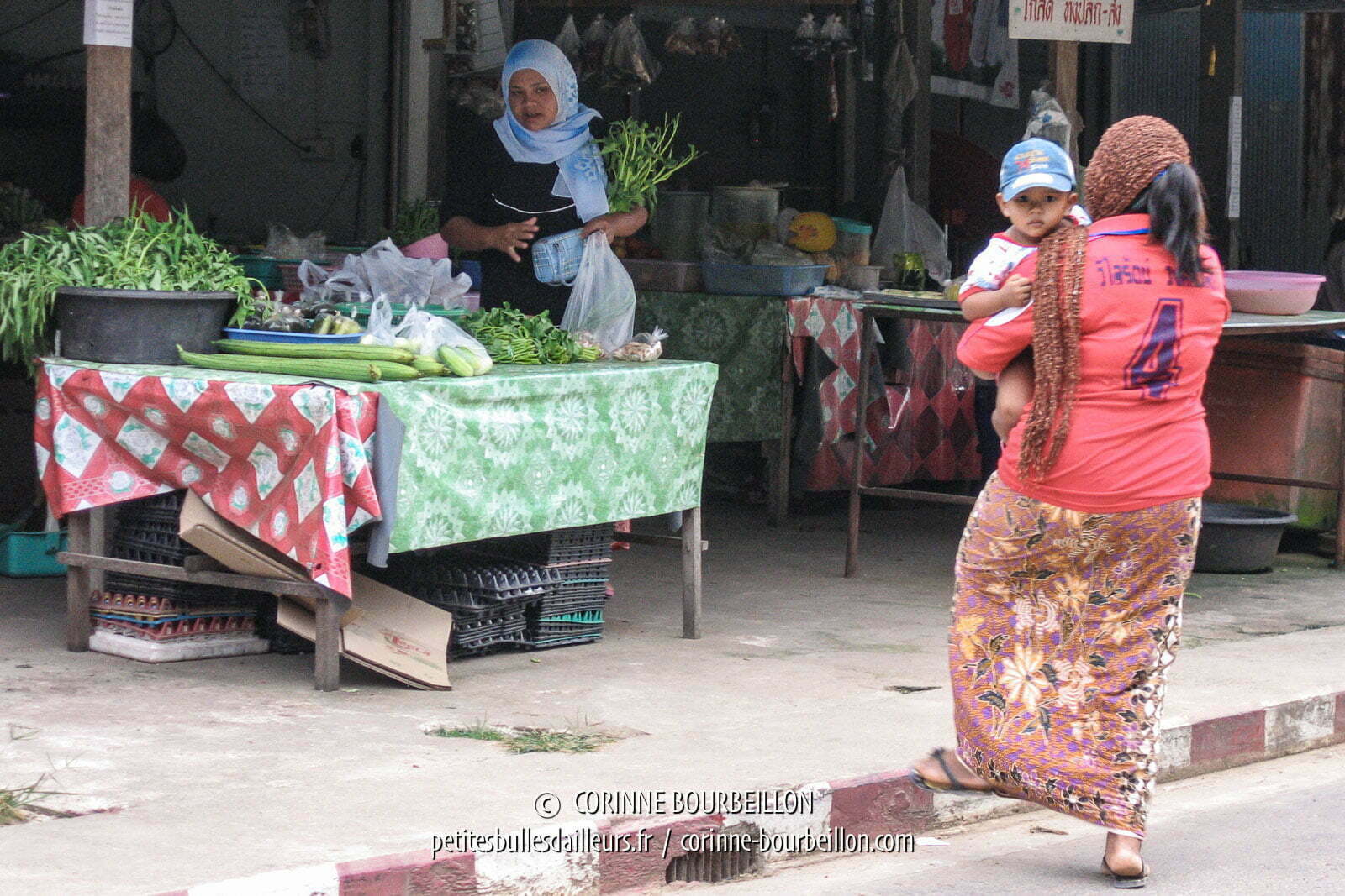 On est dans le sud de la Thaïlande, beaucoup de gens sont musulmans. Mais la religion ici n’a rien d’austère ni de pesant pour la touriste étrangère que je suis. Pas de contrainte vestimentaire particulière à observer en tant que femme, sinon la simple décence. Beaucoup de femmes de l’île portent le foulard, mais pas toutes, et elles sont nombreuses à se coiffer de cette espèce de bonnet en résille qu’on voit souvent dans les îles du coin. Les avant-bras et le bas des jambes restent découverts et les vêtements sont colorés.
