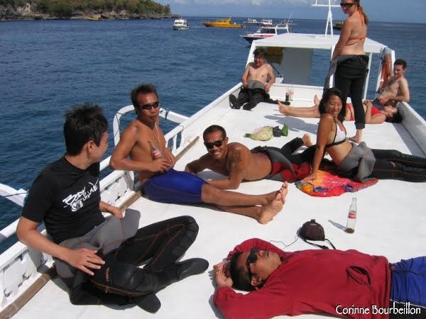 Oui, je suis une sacree veinarde d’etre a nouveau en Asie… Je suis en ce moment a Nusa Lembogan, petite ile au sud de Bali. Plongees sportives (courants et thermoclimes), mais ca vaut la peine, surtout quand on croise de grosses bebetes sympathiques comme les mantas…