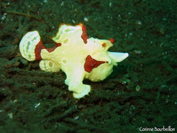 De taille modeste, jaune avec de belles taches rouge carmin, ce petit poisson-crapaud arpente vaillamment le fond de sable noir sur ses petites nageoires pectorales devenues pattes. Totalement indifférent à l’émoi qu’il provoque en nous, ignorant superbement les regards passionnés dont nous le couvons, il trace sa route. Apparemment pas plus incommodé que ça par nos bulles et nos flashes. À moins que sa petite randonnée ne soit en réalité qu’une fuite éperdue?