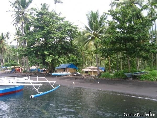 On découvre alors des falaises calcaires surmontées de jungle, entrecoupées de petites plages de sable noir, nichées dans leur ceinture de cocotiers. Quelques bicoques en bois, des bateaux traditionnels à balancier amarrés devant. À l’horizon, toujours présente, l’ombre des volcans.