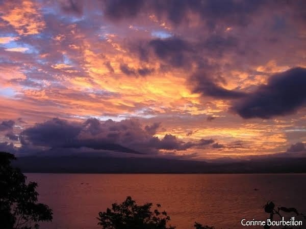 Coucher de soleil spectaculaire, derrière le volcan qui fait face à Lembeh, auquel s’accrochent les nuages.