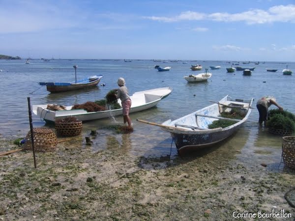 Les gens du coin sont cultivateurs d’algues. L’anse du village de Jungut Batu, protégée par le récif ou grondent les vagues, est en fait constituée de champs d’algues, qui forment une mosaïque sombre sous le bleu turquoise de l’eau.