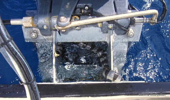 Pas intimidée du tout, la bestiole s’est approchée du bateau, ondulant en surface, pour mieux nous zieuter. Puis d’un coup, le serpent s’est faufilé dans le moteur, pour une petite inspection. Il est resté là un moment, sortant de temps en temps sa petite tête.