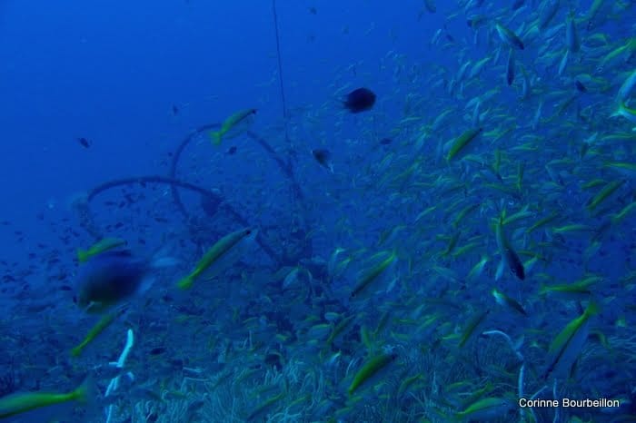 Je ne connaissais pas cette épave, surnommée Fish Heaven. Une simple barge retournée, mais elle est spectaculaire. Littéralement recouverte de poissons, en bancs si denses, qu’il faut un moment, avant de distinguer ce qu’il y a en dessous.
