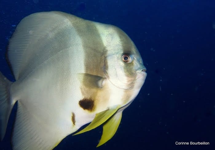 En fin de plongée, quand nous sommes au palier, dans le bleu, les platax virevoltent autour de notre petit groupe, pour un ultime salut.