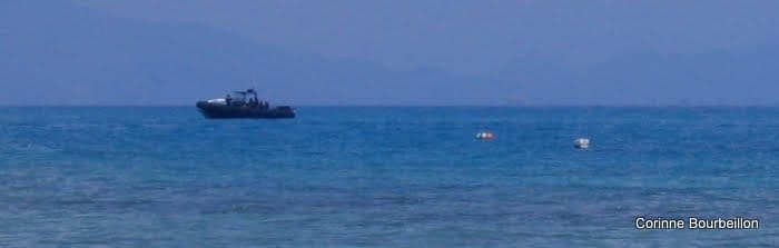 Nous pensions ensuite filer directement au second site… C’était sans compter sur les zélés flics de la mer, qui ont surgi dans leur gros canot noir surpuissant marqué POLIS, sirène hurlante, en nous faisant signe de nous arrêter.