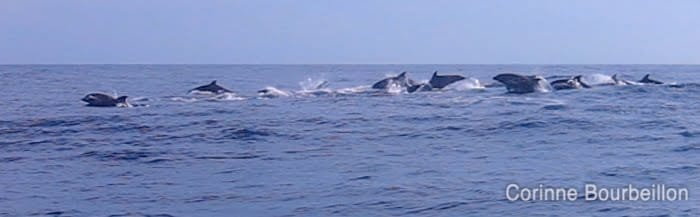 Bref, il me restait encore une chance pour en voir….la traversée retour…J’embarque, je scrute, je me mets sur le toit du bateau pour avoir une vision panoramique,et finalement j’aperçois un aileron, 2 ailerons, oui, ce sont des dauphins…Mais, ils sont loin…très loin…trop loin….je me demande même à présent si ce n’est pas moi qui les ai imaginés tellement je voulais en voir…comme les enfants qui nous assurent qu’ils ont vu le Père Noël sur les toits… 😉