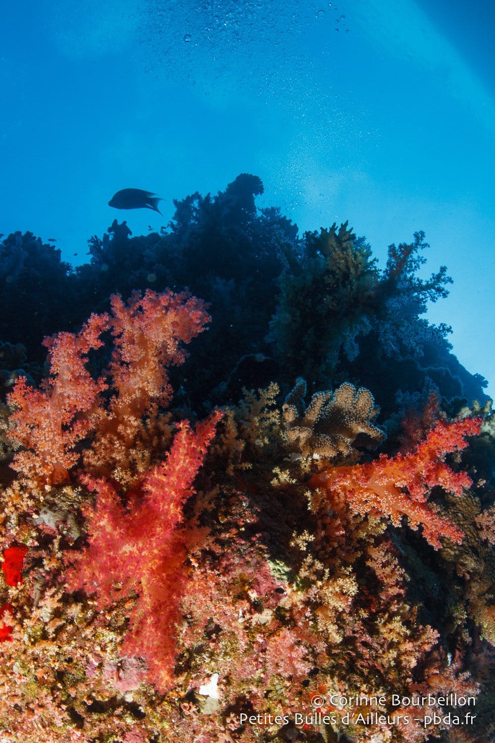 Globalement, sur la dizaine de sites que nous avons explorés, je n’ai pas l’impression qu’il y avait beaucoup de colonies d’alcyonaires. Le plus souvent, c’étaient des patates et platiers de corail dur, composant d’incroyables paysages sous-marins, paisibles ou tourmentés, propices aux plongées d’ambiance, d’autant que la visibilité était excellente.