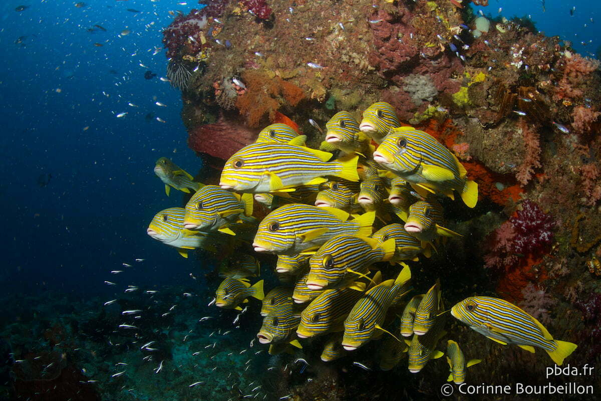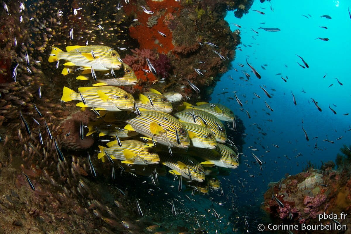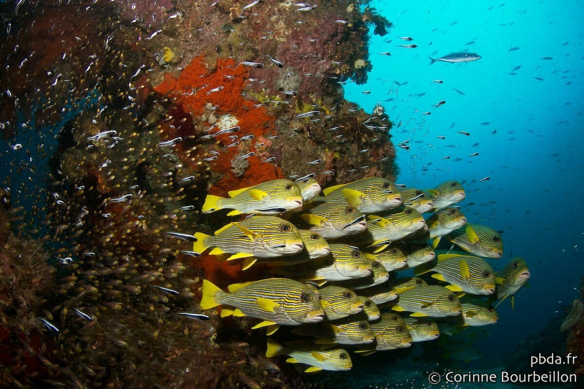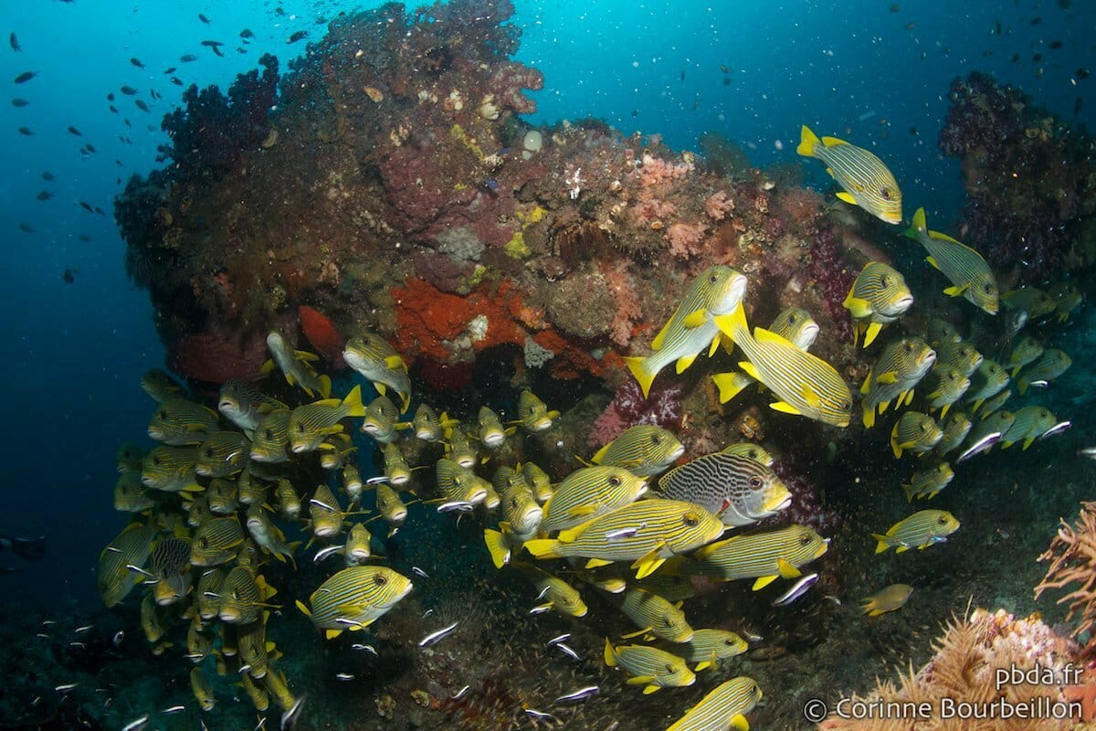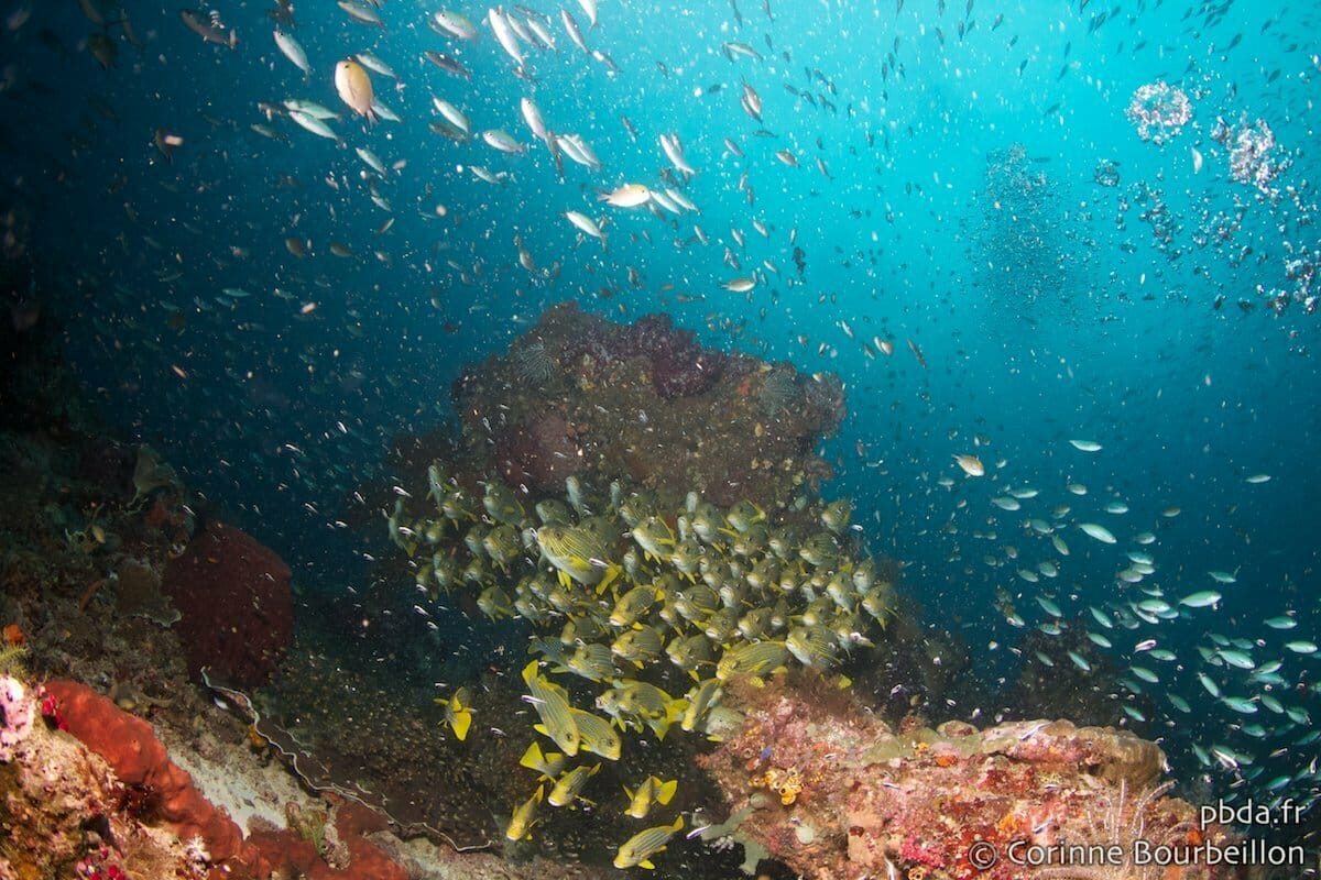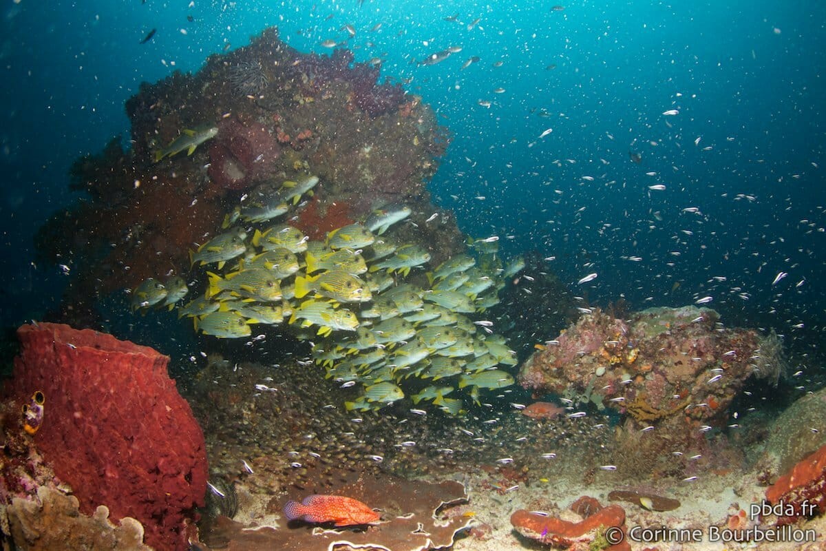 Il y a toujours un courant de folie sur ce site. Mieux vaut être accompagné d’un guide qui connaît bien le coin, pour se mettre à l’eau au bon endroit et ne pas rater le spot dont raffolent tous les photographes subaquatiques, ici : la patate aux gaterins.