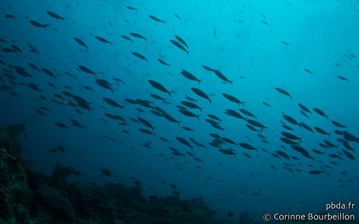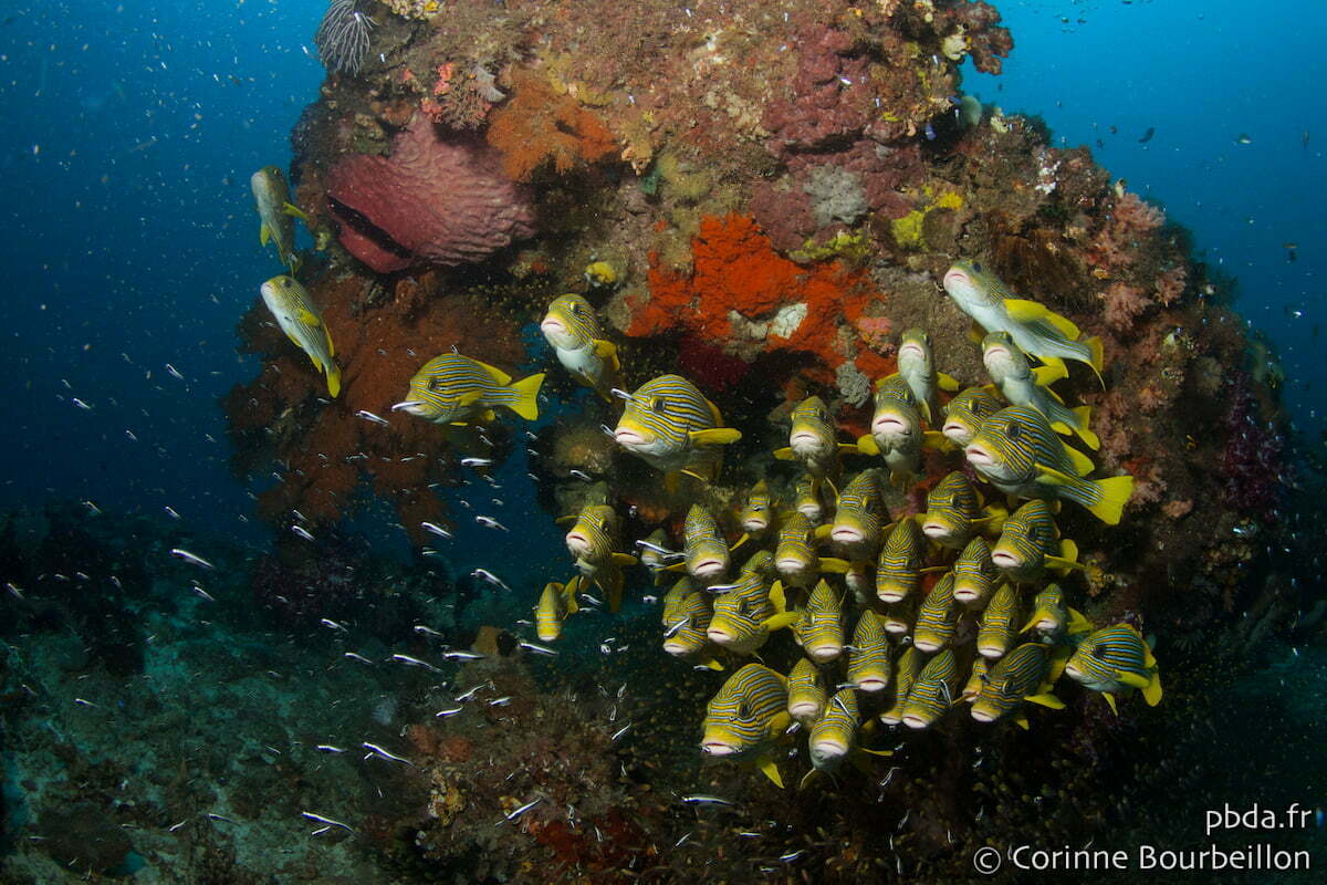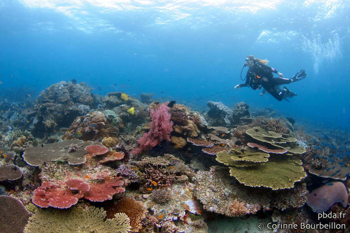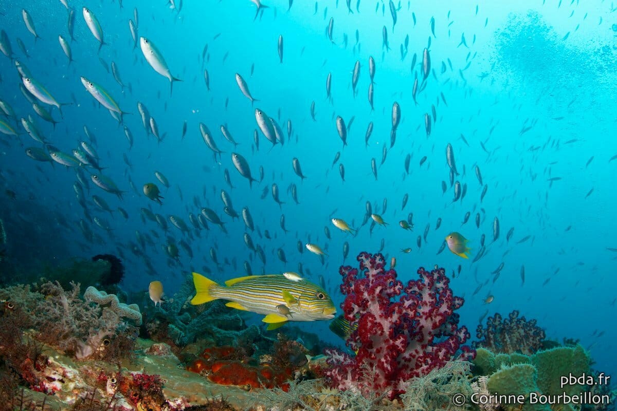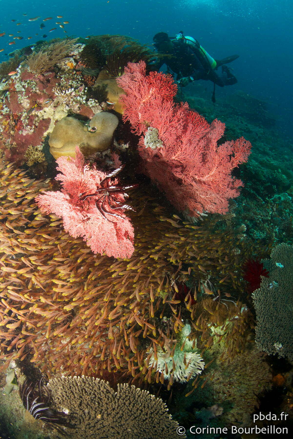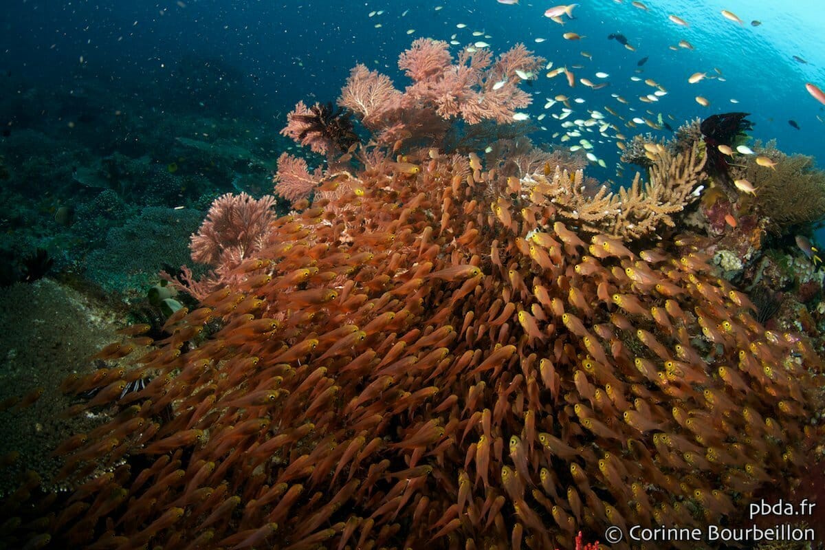 D’immenses tables de corail passent sous nos palmes. Çà et là, d’autres patates accueillent gorgones, crinoïdes et des milliers de poissons de verre.