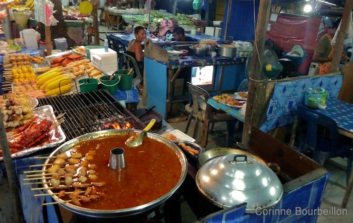 S’y succèdent tout un tas de petites échoppes et bouibouis, à la mode asiatique, où l’on sert de tout : brochettes, poissons, fruits frais, assiettes de riz, soupes de nouilles, crêpes, etc.