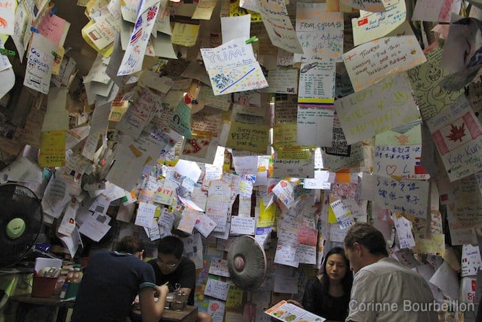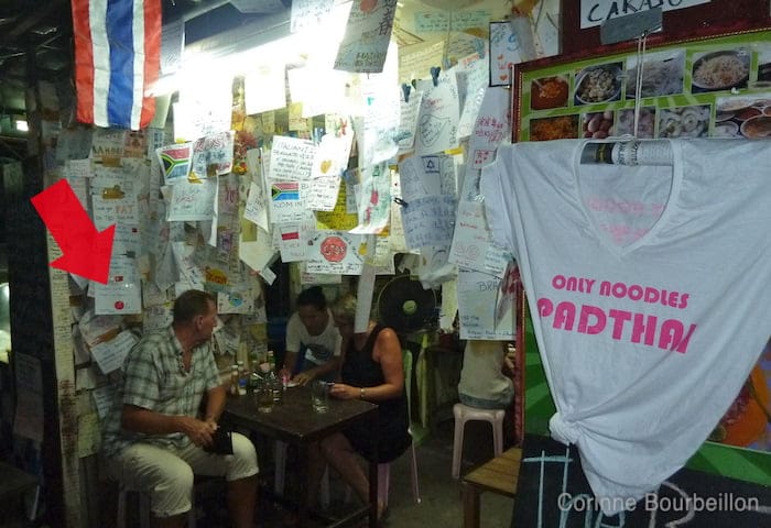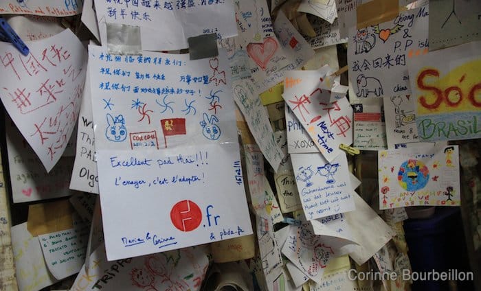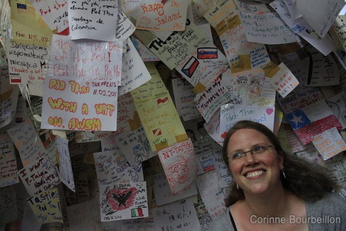 Le temps que notre commande arrive (un pad-thaï poulet et un pad-thaï crevettes), on lit les petits mots, laissés par les clients nous ayant précédées, dans toutes les langues… Que de bonnes recommandations !