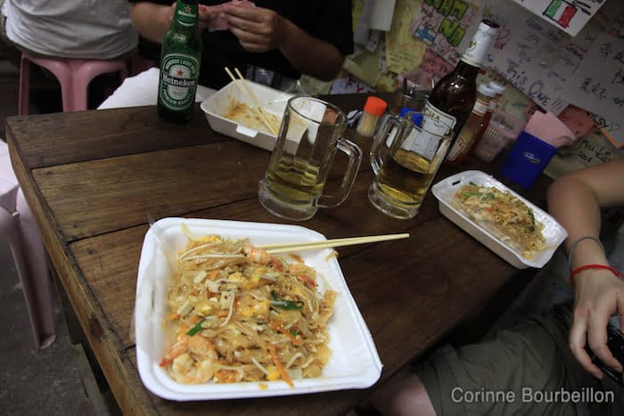 La salle en elle-même, comme tous les petits restos de rue, ne paye pas de mine. Quatres grossières tables en bois, des petites chaises en plastique, baguettes et cuillères à disposition dans des pots, des ventilos dans les coins. Une dame touille les nouilles dans la cuisine attenante, cachée derrière son wok fumant. Pas d’assiettes, les pad-thaï sont servis dans de vulgaires barquettes en plastique.