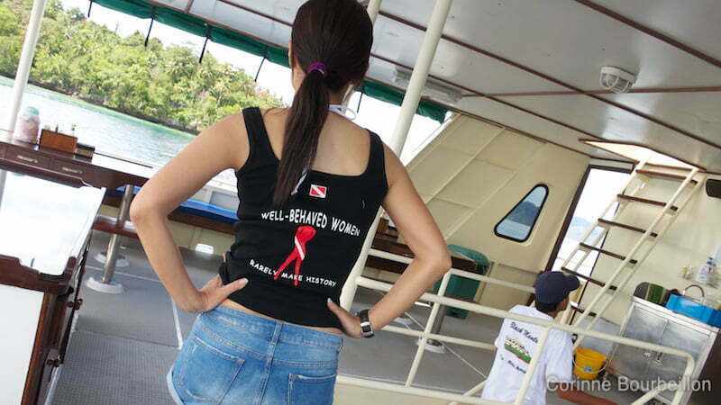 Je suis ravie d’apprendre que je partage ma cabine avec elle. On a fait connaissance à l’aéroport de Makassar, à 4h du matin. Nos cartes d’embarquement à la main, on cherchait la bonne porte pour notre vol, un peu troublées par le numéro du tableau, le numéro sur le boarding-pass et le numéro de l’annonce sonore qui n’étaient pas les mêmes… On a engagé la conversation et vite sympathisé, en découvrant qu’on partait toutes les deux plonger, et sur le même bateau !