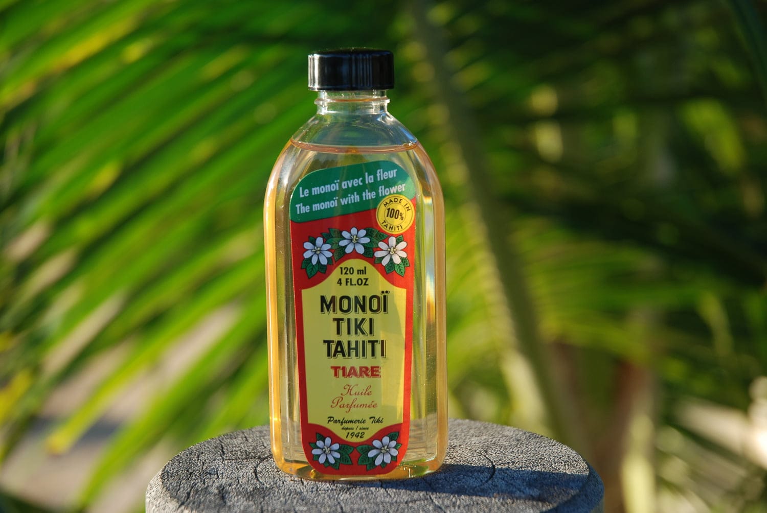 J’ignorais, avant d’en ramener une bouteille chez moi, en Bretagne, que cette huile au doux parfum figeait en dessous d’une vingtaine de degrés… Mais il suffit de la passer sous l’eau chaude pour qu’elle redevienne liquide et c’est sans conséquence sur sa conservation. Le monoï est obtenu par macération de fleurs de tiaré dans de l’huile raffinée de coprah (noix de coco). Il ne faut surtout pas en mettre avant de s’exposer au soleil, mais au contraire s’en servir après, comme le font les Polynésiennes, pour hydrater la peau et nourrir les cheveux.