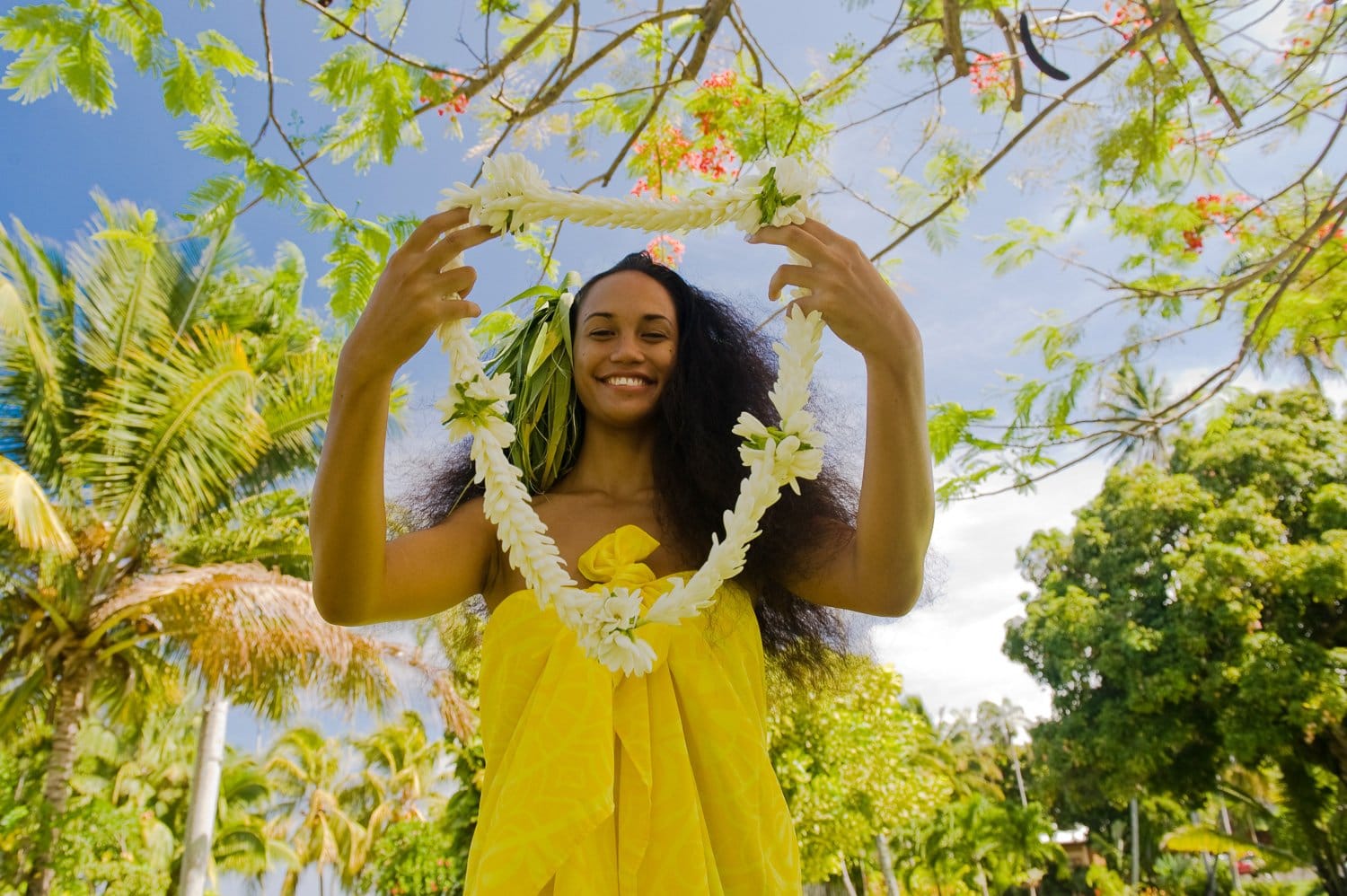 Le tiaré Tahiti, c’est l’emblème de la Polynésie française ! Hommes et femmes portent la fleur à l’oreille (en bouton pour les premiers, en corolle pour les secondes) et on prend l’habitude de faire de même, lors d’un séjour à Tahiti et dans ses îles. C’est tout à fait normal ! Elle sent merveilleusement bon et le parfum du collier de fleurs qu’on vous passe autour du cou à l’arrivée est inoubliable. Bon à savoir : la fleur à l’oreille gauche signifie que votre cœur est déjà pris, à l’oreille droite que vous êtes disponible…