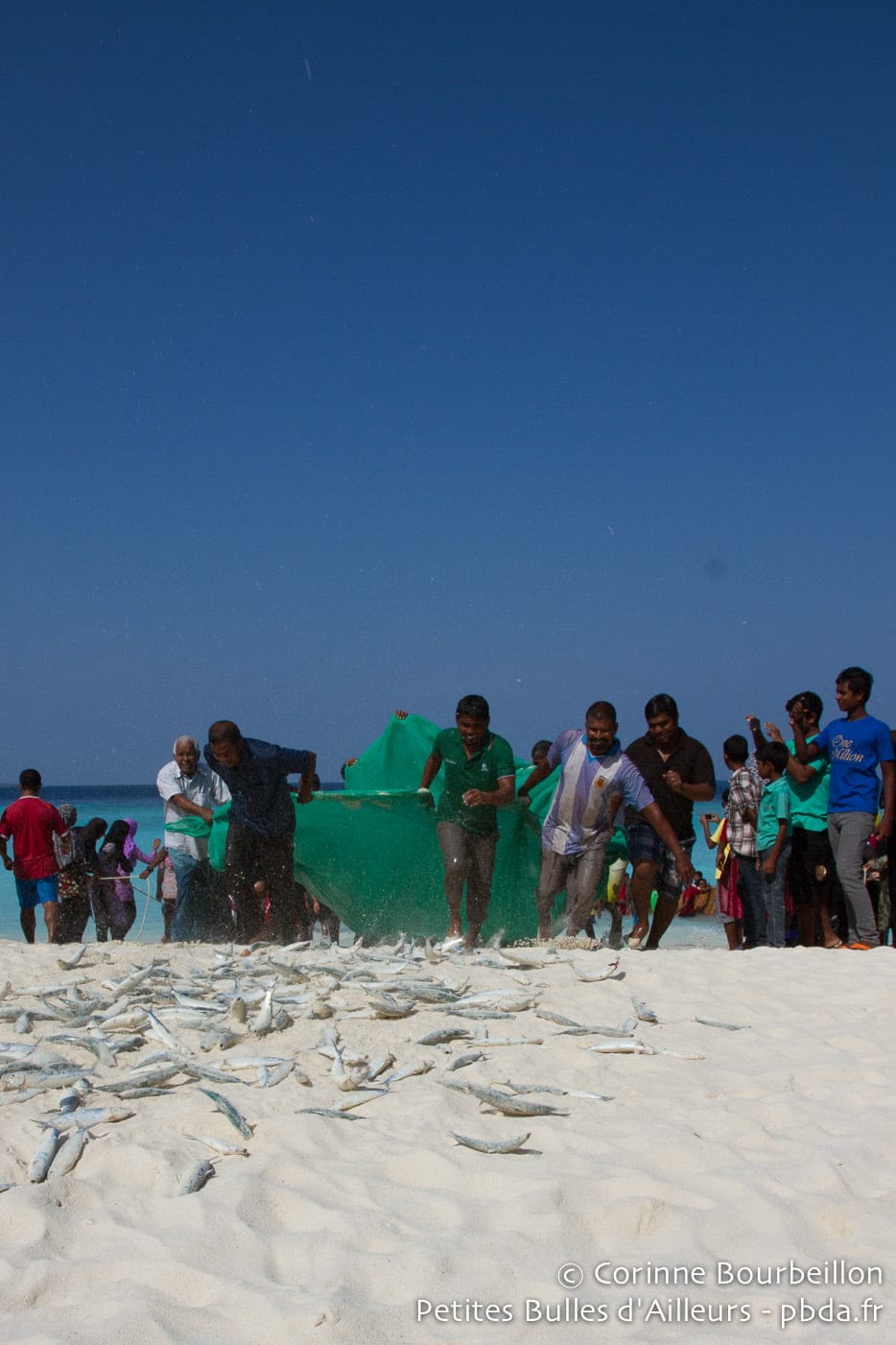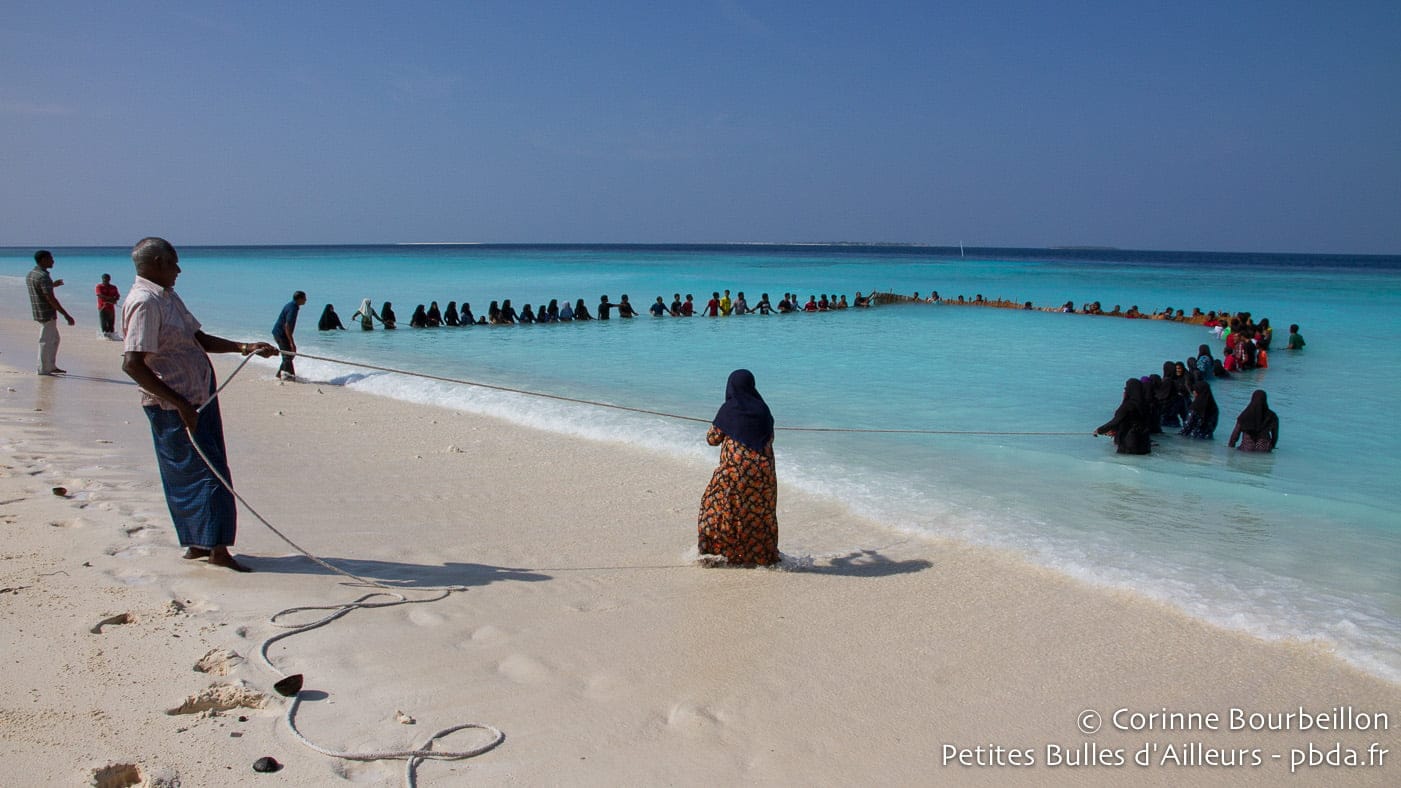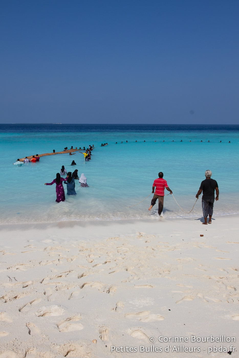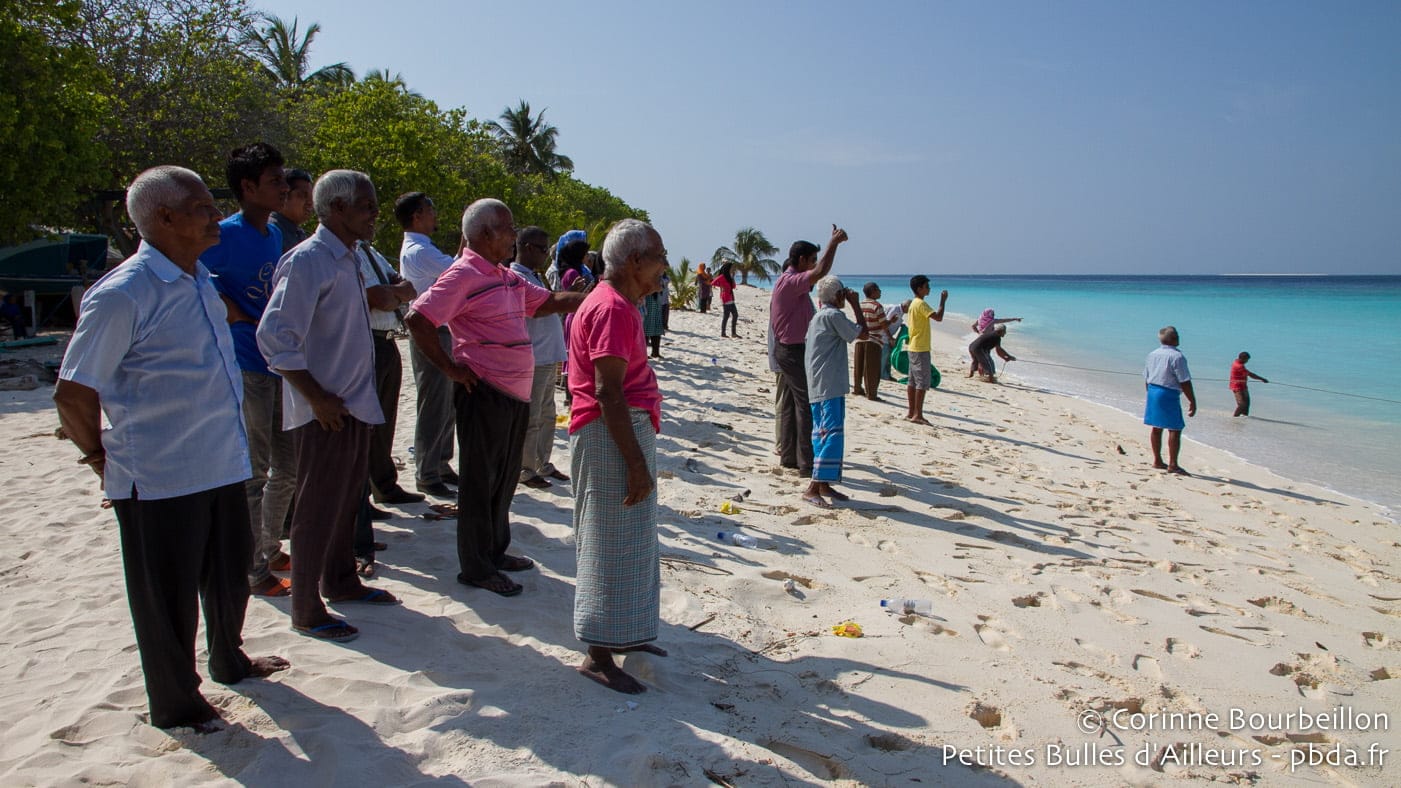 Coup de bol, nous sommes là au bon endroit au bon moment pour assister à un événement pas si fréquent. Ce jour-là, à Utheem, tout le village s’est rassemblé sur le sable, face à la mer pour une partie de pêche traditionnelle collective, pleine d’excitation et de gaieté.