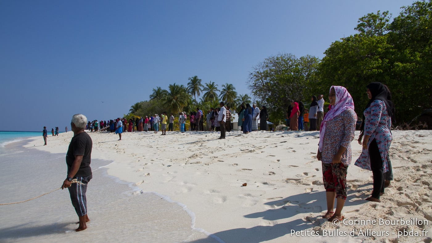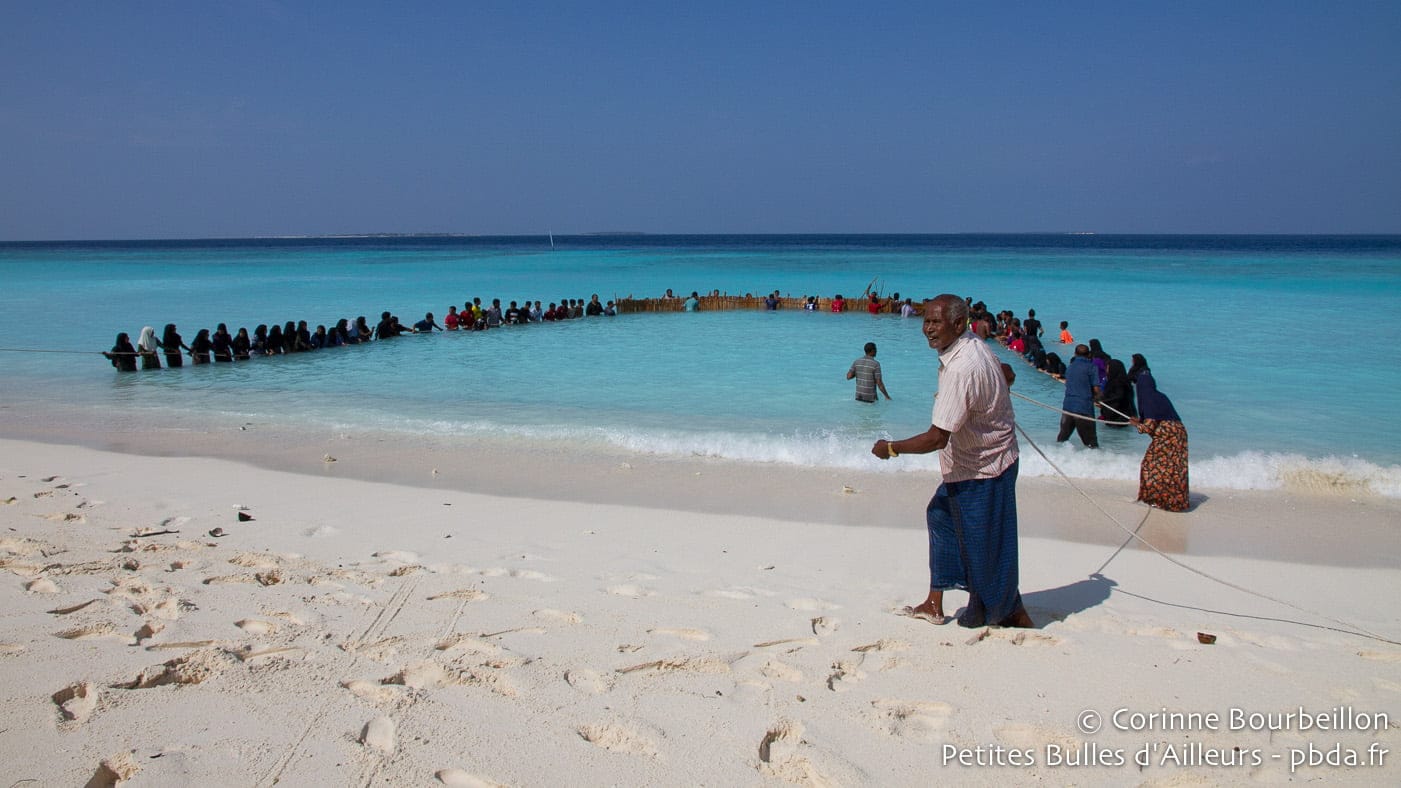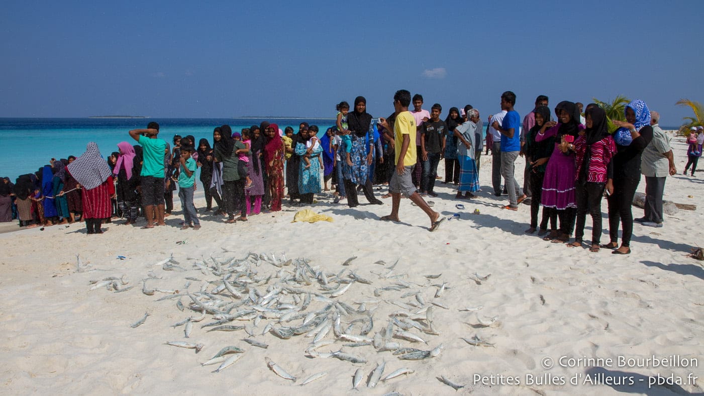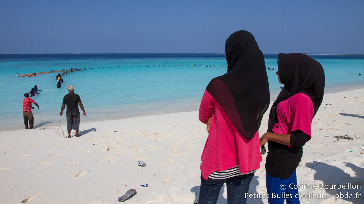 Coup de bol, nous sommes là au bon endroit au bon moment pour assister à un événement pas si fréquent. Ce jour-là, à Utheem, tout le village s’est rassemblé sur le sable, face à la mer pour une partie de pêche traditionnelle collective, pleine d’excitation et de gaieté.
