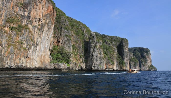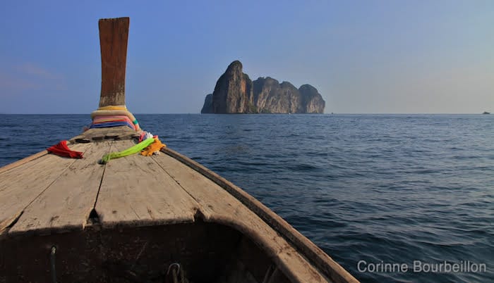 Quand, après avoir longé les falaises de Phi Phi Don, on voit approcher Phi Phi Leh, dans l’axe de la proue du long-tail boat, on a un peu l’impression de découvrir une île mystérieuse, inaccessible, perdue dans l’océan… Une illusion que je savoure avec délice.
