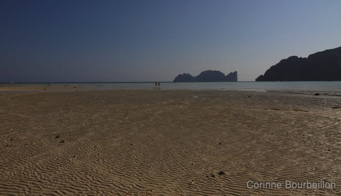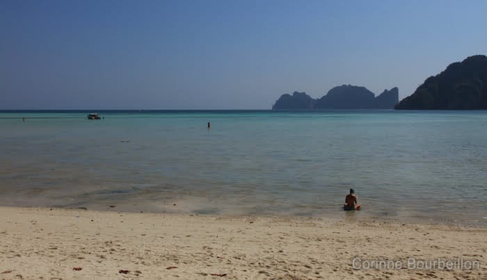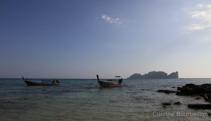 Heureusement pour ma pote et moi, nous sommes en fin de journée et les speed-boats venus de Phuket commencent à partir. Ne restent bientôt plus que les long-tail boats, qui un à un finissent par s’en aller, eux aussi. La plage retrouve un semblant de calme.
