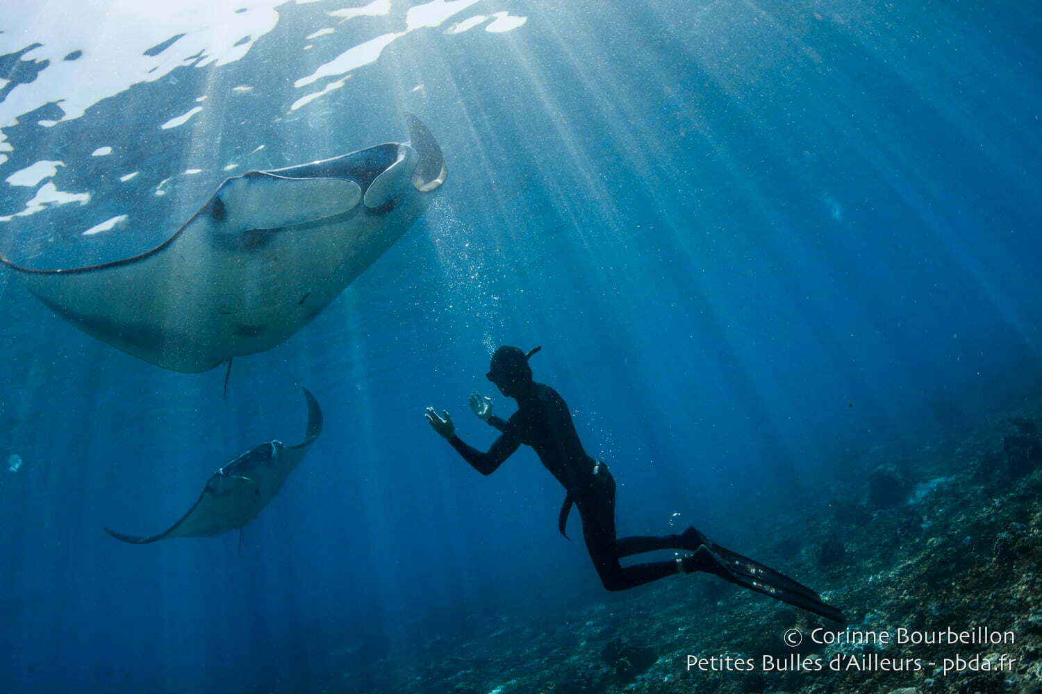 Ci-dessous, un autre moment magique lors d’une plongée à Komodo : le face à face émouvant d’un apnéiste et d’une raie manta, au site de Karang Makassar.