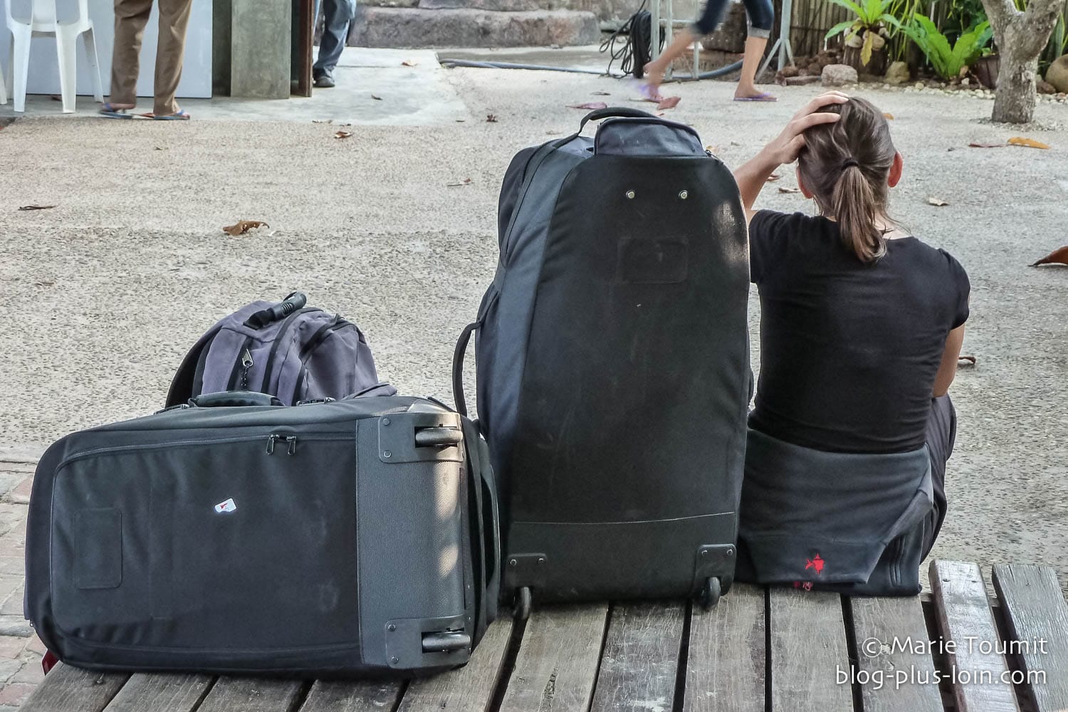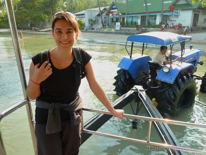 Je nous y revois ! Le panneau avec mon nom écrit en grand à l’aéroport : “L’autre fille”. Notre attente près du débarcadère à carrosse-tracteur, les pieds nus qui touchent enfin le sable, la course contre le soleil qui s’enfonce au loin, les tours en carrosse-tracteur, les Thaïs abasourdis par le poids de ton sac !