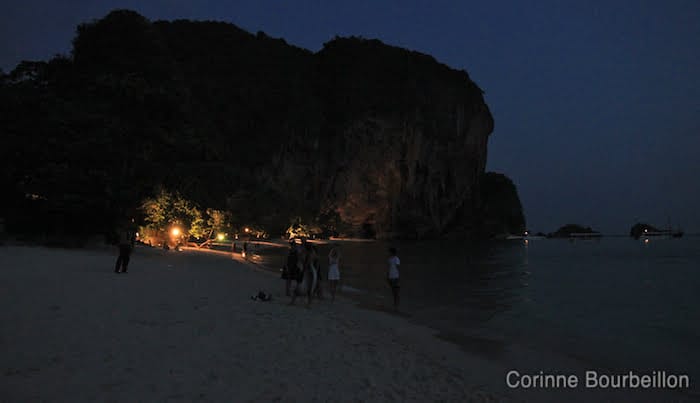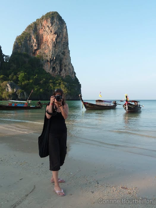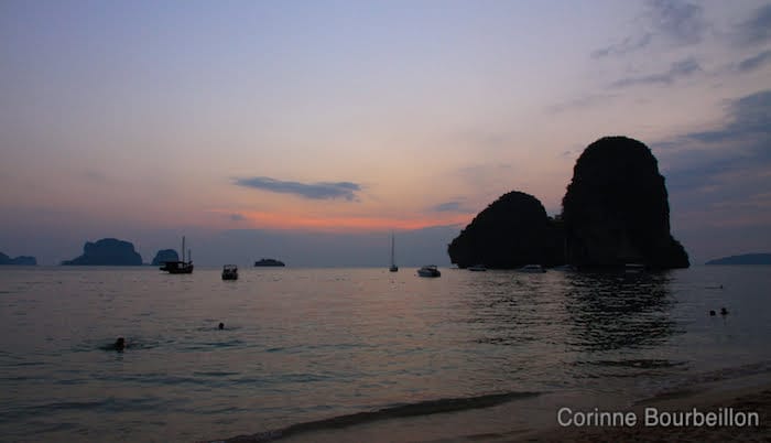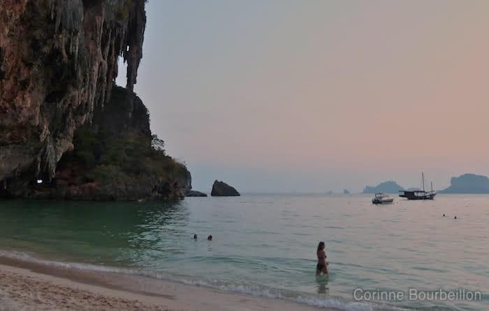 Après le Cambodge, pour l’arrivée en Thaïlande, c’est ce que je lui ai promis, à l’autre fille : un bain de mer et un coucher de soleil à Krabi, sur la plage de la Princesse, la fameuse Phra Nang Beach…