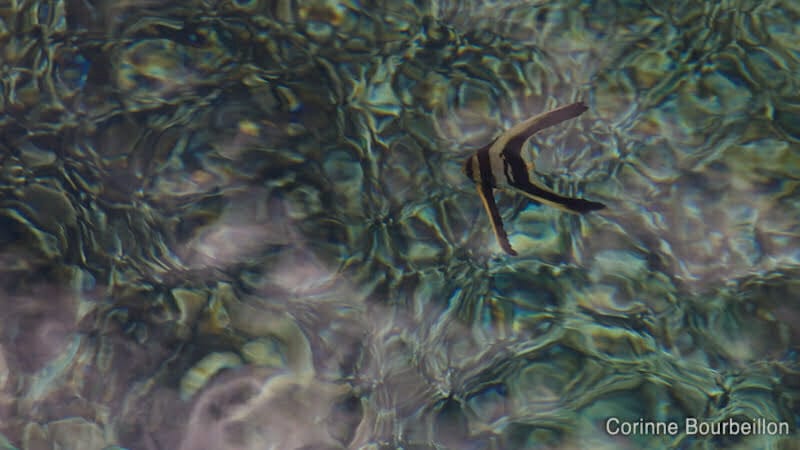 On voit des bancs de petits poissons jouer autour des piliers, parfaitement visibles depuis le ponton. Des platax juvéniles vivent ici, en bordure du trou bleu, ils sont tous les jours au même endroit.