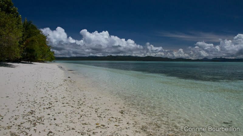 Dans l’axe du banc de sable, il y a un îlot flanqué d’une hutte à la mode locale, en feuilles de cocotier tressées, qui sert d’abri. À l’horizon, une ligne montagneuse, souvent ourlée de nuages, qui se gonflent de pluie au fil de la journée.