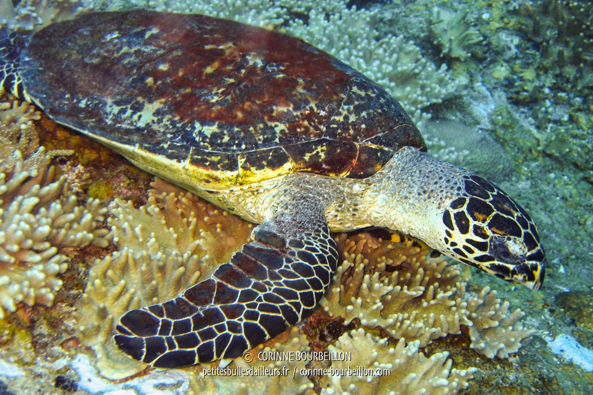 Pas mal de tortues croisent notre route et même quelques requins à pointe blanche, que je n’ai hélas pas réussi à photographier, seulement à filmer… Trop rapides pour le lent autofocus numérique de mon petit compact !