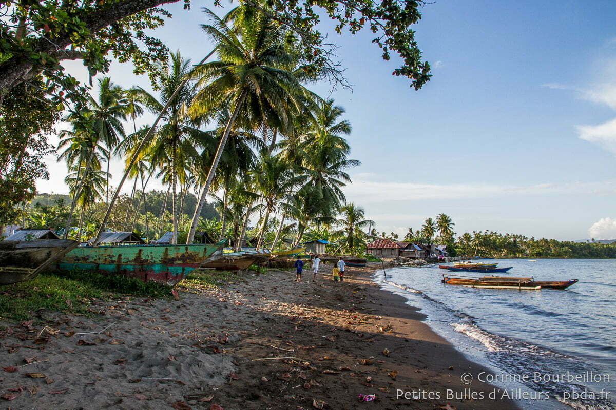 Il y a des barques traditionnelles et des filets de pêche sur la plage, des petits champs et des baraques en bois derrière les cocotiers.
