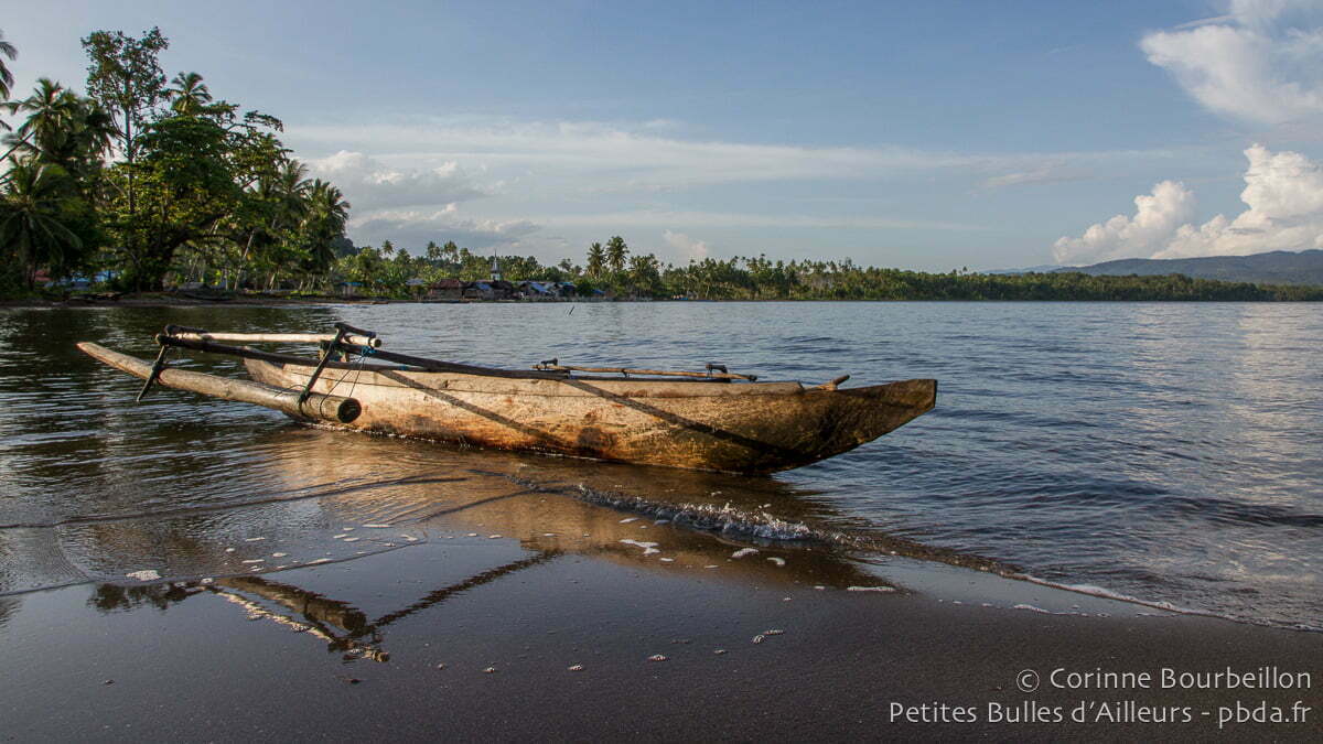 Ta photo de la pirogue à balancier avec la lumière dorée du soir me laisse rêveuse et contemplative….elle pose bien en premier plan avec son bois brut qui prend la teinte “or” et contraste avec le sable noir.