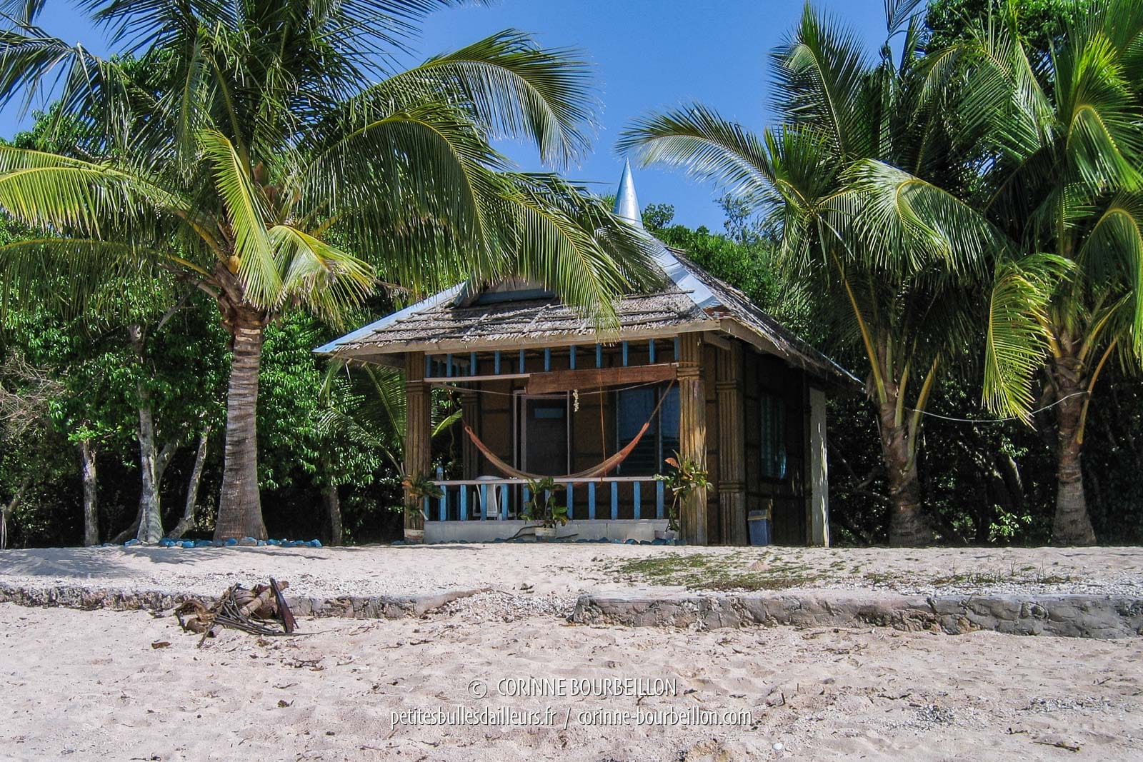 D’humeur siestale, ravie d’avoir déniché un coin tranquille, je commence par tester le hamac de la terrasse. Pas d’autre bruit, ici, que le murmure des vagues et le frisson des palmes de cocotiers…