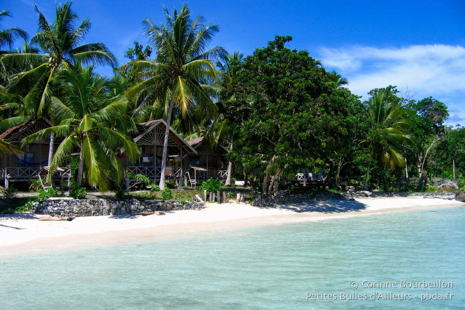 On débarque par un immense ponton de bois qui surplombe une eau transparente. En arrivant, j’ai peine à en croire mes yeux : une mignonnette plage frangée de cocotiers sert d’écrin à une dizaine de bungalows de bois.