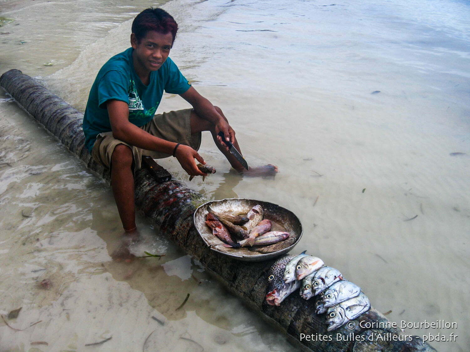 C’est marrant : le p’tit gars en bleu et blanc que tu as pris en photo (près de la barque retournée), je l’ai vu moi aussi ! Il a 16 ans et travaille à Poya Lisa maintenant (photo à l’appui si tu veux) 🙂 C’est lui qui emmène les touristes sur les spots de snorkeling.