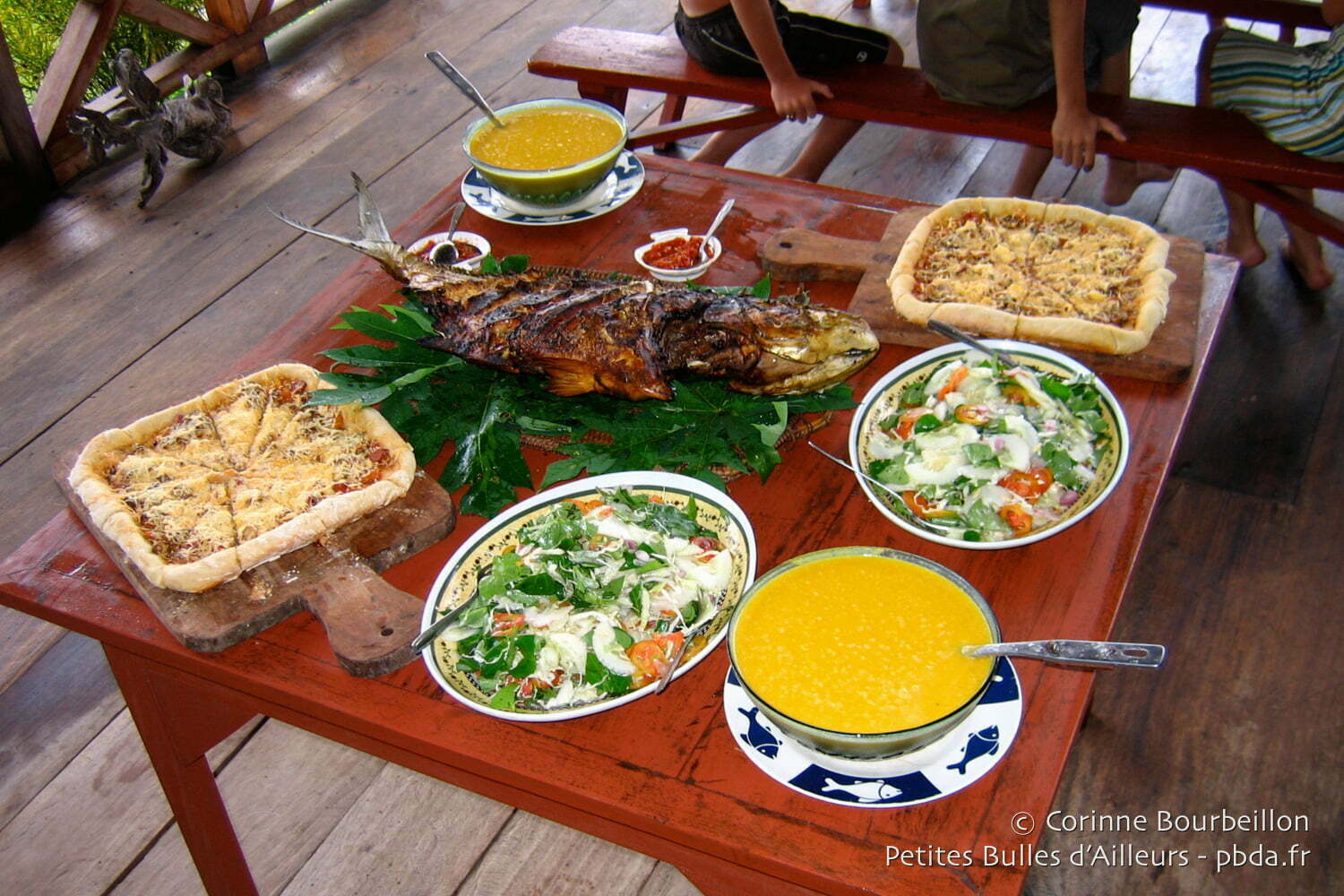 Il y a des poissons frais grillés, des salades composés riches de mille parfums d’herbes et une incroyable soupe, à base de citrouille et lait de coco, délicieuse.