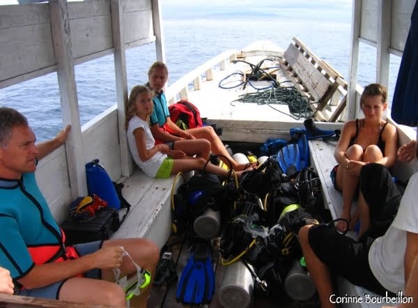 Ce matin-là, Uwe, l’instructeur allemand qui organise les plongées, nous emmène sur un site pas trop éloigné, Bulu Tuko. Mes amis hollandais Suzanna et Johan plongent avec moi. Leurs enfants nous accompagnent, mais resteront sur le bateau à faire du snorkeling. Fabian et Stefanie, un jeune couple d’Allemands très sympas, qui scotchent sur l’île depuis quinze jours, complètent la palanquée.