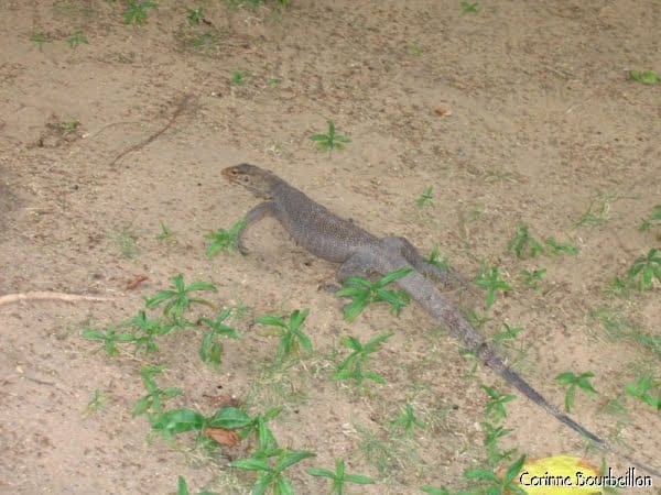 Ça m’amuse, car je viens de faire exactement la même chose, près de la plage. Ces espèces de gros lézards préhistoriques sont très familiers, ici. Ils rôdent près des habitations, sur la plage, dans les jardins, farfouillent dans les poubelles… Mais dès qu’on tente de les approcher, ils filent à toute vitesse. Pas facile de les prendre en photo !