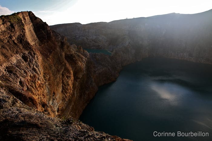 De l’autre côté d’Inspiration Point, il y a le troisième lac, le lac noir, Ata Mbupu. Là encore, j’ai de la chance. Il est souvent planqué sous un amas de nuages opaques. Mais ceux-ci s’effilochent progressivement sous mes yeux. On finit par voir la falaise blanchâtre du cratère frangé de verdure se refléter dans l’encre de l’eau. Étonnant.