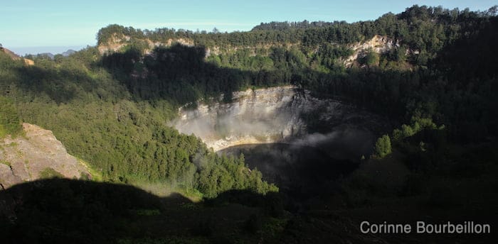 Y aller à 5h du mat’ quand le soleil se lève est également une expérience, accompagné d’un vendeur de ginger-coffee et de sa loupiote, tu as l’impression d’être sur une autre planète, le froid est mordant, il y a une mer de nuages, du brouillard, les cratères sombres… 😕 soudain un rayon de soleil qui dégage les nuages et tu vois apparaître le vert acide du lac le plus proche. 8)